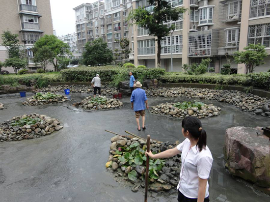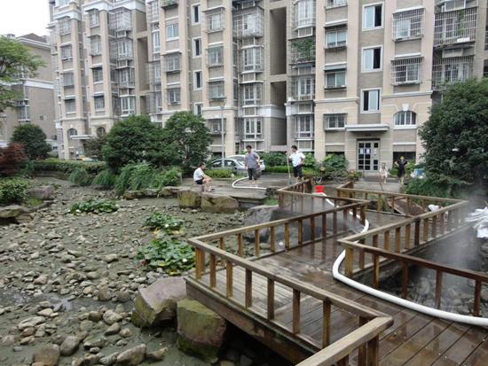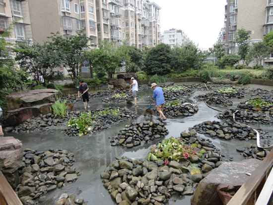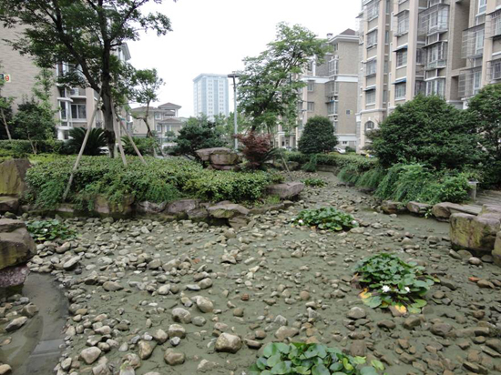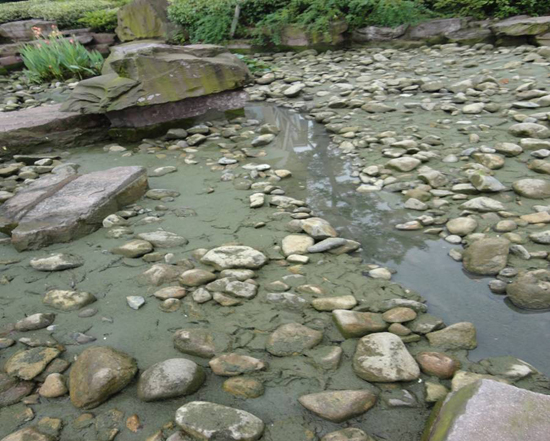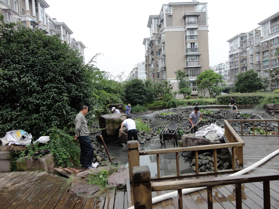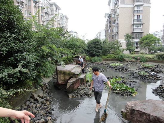 永成物业的锦江花园环境优美,小区中心有亭台楼阁、九曲回廊,楼阁的周边水景设施环绕,就象是一条玉带緾绕在美丽的景色中,美中不足的是水景的人工河道中铺满了鹅卵石,导致河道的清淤工作无法正常开展,河道的水质不断恶化,影响了小区业主的心情和正常生活。