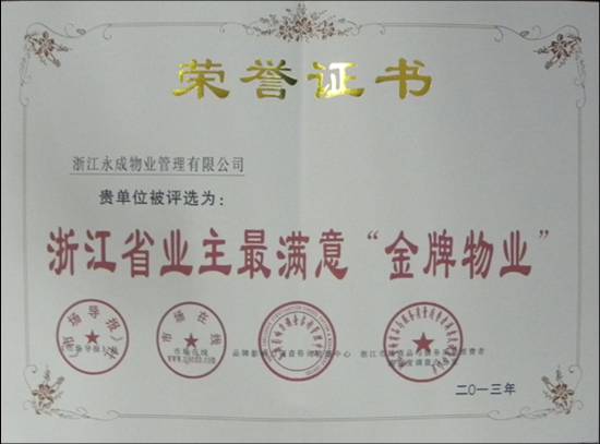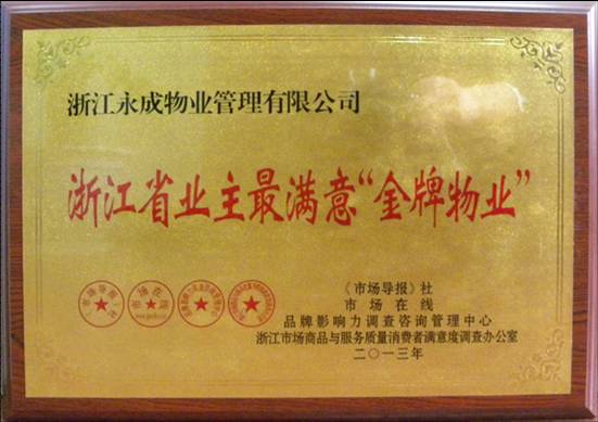 热烈祝贺浙江永成物业管理有限公司荣获“浙江省市场消费者满意单位”