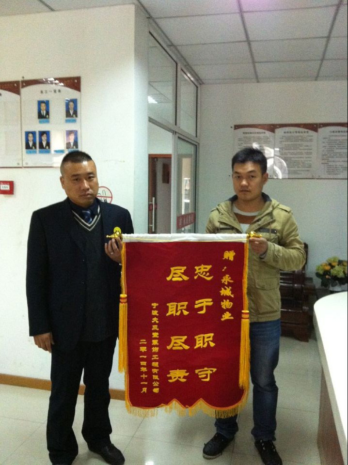 2014年11月15号下午1点左右,城南公馆7幢402业主家拉出一车高档装修材料。我司物品进出都要登记问询,在西门保安上前问询下,运送者讲的模糊不清,于是保安就叫我们管理处查询业主是否有这个事情,查出实为偷盗。业主为了感谢我们帮他挽回重大的损失,所以做了一面锦旗,送于我们物业公司。