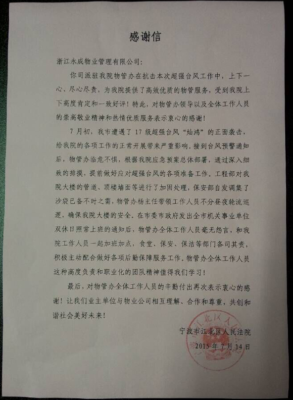 永成物业:江北区人民法院物业管理处尽心尽责,受到业主表扬